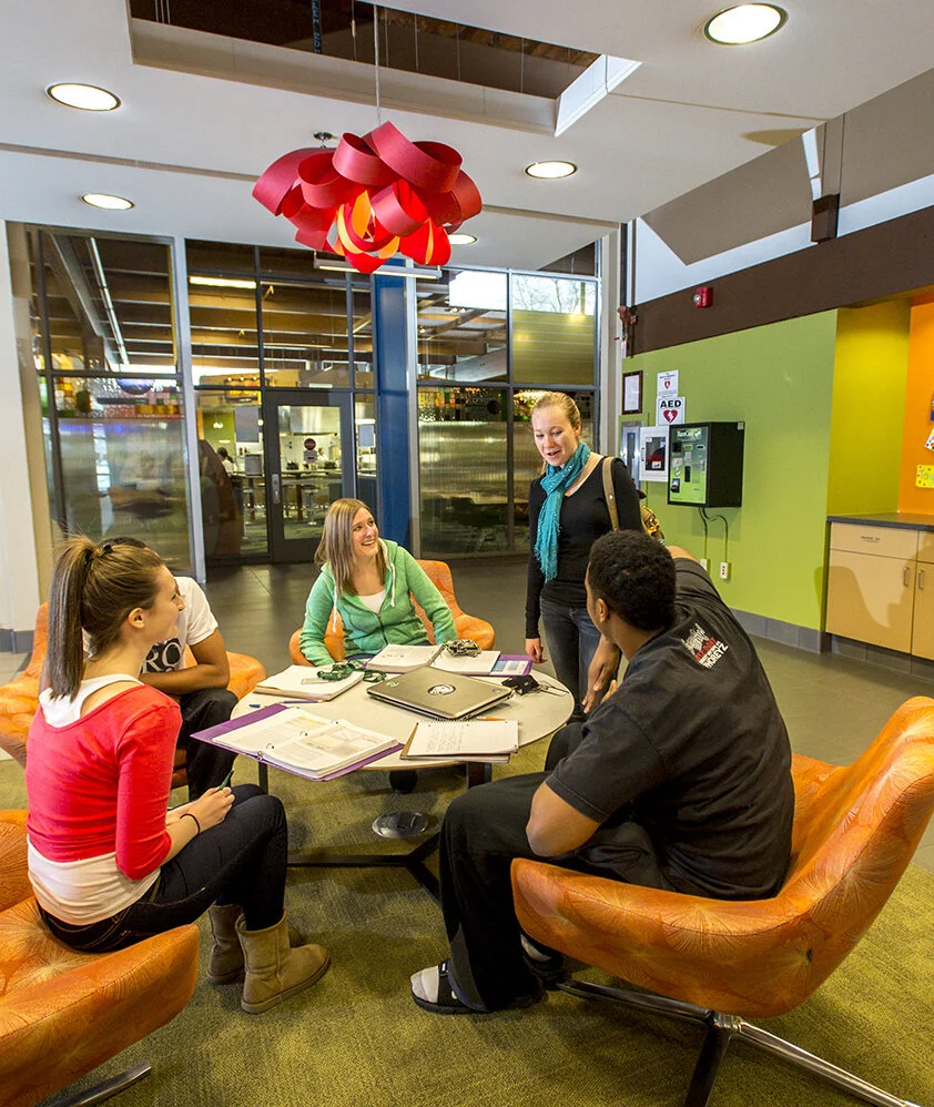 GOALS ACHIEVED: established front door with improved first impression, dynamic student “chill out” spaces, abundant natural light