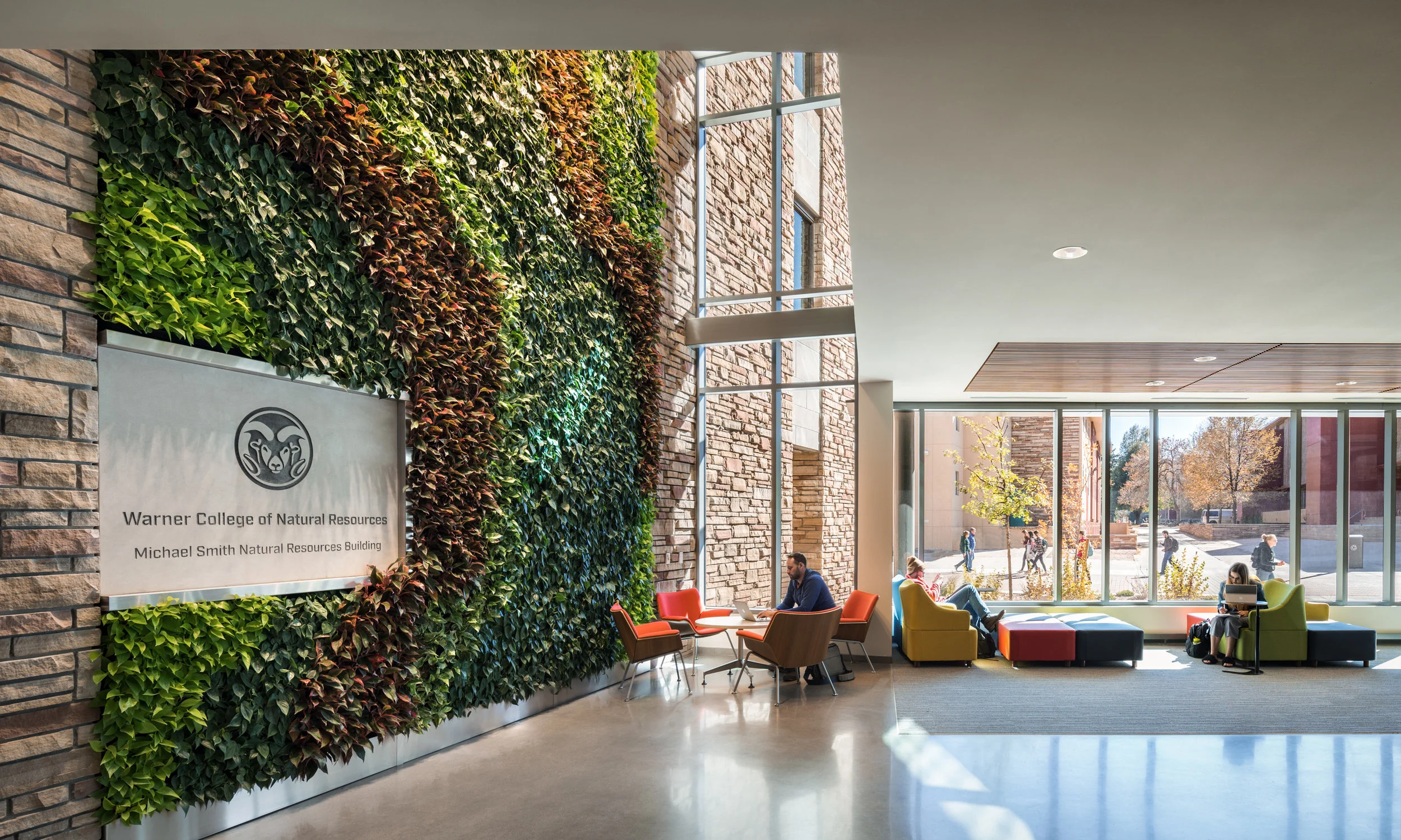 Capitalizing on the community it serves, the natural resources brand is reinforced with every detail. The signature stacked masonry fin walls were used as student teaching tools in regard to the primary building systems distribution. The implementation of live-edge community tables made from felled campus trees, various interior plantings, operable office windows, and fritted glass, to name a few, are used as creative and tactile moments that engage the senses for enhanced learning. While the building aesthetic is derived from the CSU kit of parts, the new entrance gives a unique identity to the College of Natural Resources with a dramatic, canted, 24-inch-diameter round, Douglas fir glulam column spanning 55-feet to support a heroic cantilevered roof. Once inside, visitors are greeted with a two-story living wall and an extended atrium for gathering. A collection of murals based on prehistoric eras of geology bring forth conscious connections to the curriculum taught within. Perhaps the most memorable design elements are the “treehouse” collaboration rooms that overlook the Sherwood Forest through floor-to-ceiling windows. With a unique view of the Forest’s tree canopy from each level, the architecture influences experience-based learning that is practical yet playful. Working as a convertible space to bring the outdoors in, the Canopy Meeting Room on the fourth floor even has a vertical folding façade that can be completely opened to the exterior.